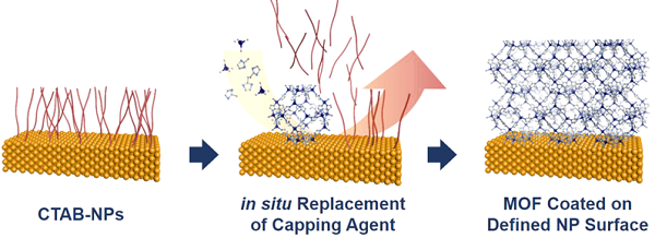 近年来,在其他材料的表面上应用金属有机框架(MOF)形成多功能材料已经引起了人们的极大关注。但是,由于结构尺寸上的数量级差异,引导MOF过度增长仍然具有一定的挑战性。在此,美国波士顿学院的Chia-Kuang Tsung, Yang Li, Wei-Shang Lo, Furui Zhang和美国爱荷华州立大学的Wenyu Huang等人开发了一种在NP和涂层MOF之间生成可控界面的方法。通过利用弱吸附封端剂的动态特性来介导MOF在金属纳米颗粒(NPs)表面的生长。研究表明,CTAB分子逐渐从金属表面解离,并被MOF原位取代,从而导致金属NP与ZIF-8之间生成了直接界面。受到良好控制的界面会导致形成具有特定晶面排列,无需捕获封端剂,从而形成统一的核壳结构,一个NP封装在一个单晶MOF纳米晶体中。该策略在ZIF-8到UiO-66型MOF体系中得到了验证。定义界面优于传统方法生成的不定义界面,对α、β不饱和醛的加氢、对不饱和醇具有高的选择性。这一策略开启了一种新的途径,在结构尺寸截然不同的材料之间创建对齐的界面。相关研究以“Creating an Aligned Interface between Nanoparticles and MOFs by Concurrent Replacement of Capping Agents”为题目,发表在JACS上。DOI: 10.1021/jacs.1c01357
