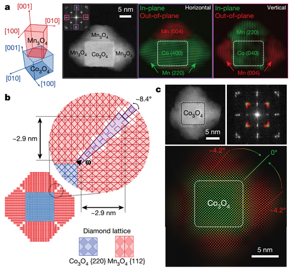 与晶界相关的拓扑缺陷(GB缺陷)对纳米晶材料的电学、光学、磁性、力学和化学性质的影响是众所周知的。然而,通过实验来阐明这种影响是困难的,因为晶粒通常表现出大范围的尺寸,形状和随机的相对取向。加州大学伯克利分校A. Paul Alivisatos联合韩国首尔国立大学Taeghwan Hyeon教授等人证明了对胶体多面体纳米晶体的异质外延进行精确控制可以使晶粒有序生长,从而可以生产出具有均匀GB缺陷的材料样品。用包含Co3O4纳米立方核的多颗粒纳米晶体来说明这个方法,该核在每个面上都带有Mn3O4壳。各个壳是与对称性相关的相互连接的晶粒,相邻四方Mn3O4晶粒之间的大几何错位导致在Co3O4纳米立方核的锋利边缘处形成倾斜边界,这些倾斜边界通过错位连接。研究确定了控制这些高度有序的多晶粒纳米结构生产的四个设计原则。首先,衬底纳米晶体的形状必须指导过度生长相的晶体学取向。其次,衬底的尺寸必须小于位错之间的特征距离。第三,过度生长相与基底之间的不相容对称性增加了晶粒之间的几何杂波应变。第四,对于在接近平衡条件下形成GB的情况,需要通过配体钝化增加的弹性能来平衡壳的表面能。利用这些原理,可以长出一系列包含明显GB缺陷的多晶粒纳米晶体。相关研究以“Design and synthesis of multigrain nanocrystals via geometric misfit strain”为题目,发表在Science上。DOI: 10.1038/s41586-019-1899-3