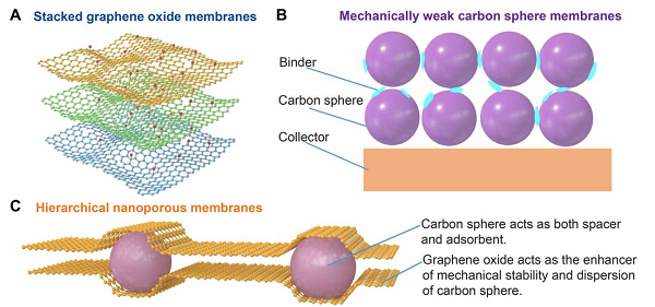 图10 GO膜、碳球膜和HNMs膜的示意图比较