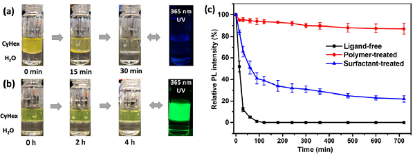 图2 PS-P4VP处理前后对比的NWs溶液及样品在胶体稳定性测试中相对PL强度