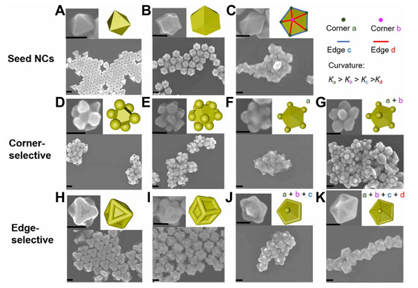 精确控制纳米晶体(NC)形状和组成的能力在催化和等离子体等许多领域都是有用的。种子介导的策略已被证明对准备各种各样的结构是有效的,但对如何选择性地生长角、边和面的理解不足,限制了控制结构进化的一般策略的发展。在这里,美国西北大学Chad A. Mirkin教授等人报告了一种通用的合成策略,用于指导各向异性种子的位点特异性生长,以制备设计纳米结构库。这种策略利用成核能垒剖面和生长溶液的化学势来控制NCs的特定位置生长成奇异的形状和成分。该策略不仅可以控制各向异性种子的生长部位,而且可以控制新生长区域的暴露部位。许多形状的NCs被合成,包括超过10个从来没有报道过的NCs,原则上,还有很多其他的可能。相关研究以“Corner-, edge-, and facet-controlled growth of nanocrystals”为题目,发表在Science Advances上。DOI: 10.1126/sciadv.abf1410