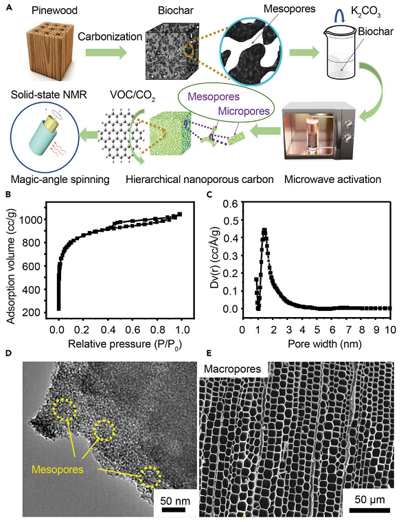 分级纳米孔碳(HNC)是一种有效的吸附挥发性有机物的吸附剂。然而,在层次结构调控、吸附质吸收的吸附机制和HNC内部的相互作用方面仍然存在问题。斯坦福大学崔屹教授等人以木材为原料,采用K2CO3活化的微波诱导加热方法合成HNC。HNC表现出Murray定律的多尺度结构,促进了通过核磁共振(NMR)吸附质的分子尺度研究。NMR化学位移与吸附剂产生的环电流效应一致。研究的NMR为测定吸附质在HNC中的吸附提供了一种简便的方法。挥发性有机化合物的吸附结果表明,随着时间的推移,NMR化学位移发生了变化,首先吸附到中孔,然后扩散到微孔。Schroeder定理可以通过观察到的液体与蒸汽相之间的变化来证明HNC。这些HNC具有较高的CO2吸附能力,预示着在碳捕集方面的应用。相关研究以“Revealing Molecular Mechanisms in Hierarchical Nanoporous Carbon via Nuclear Magnetic Resonance”为题目,发表在Matter上。DOI: 10.1016/j.matt.2020.09.024