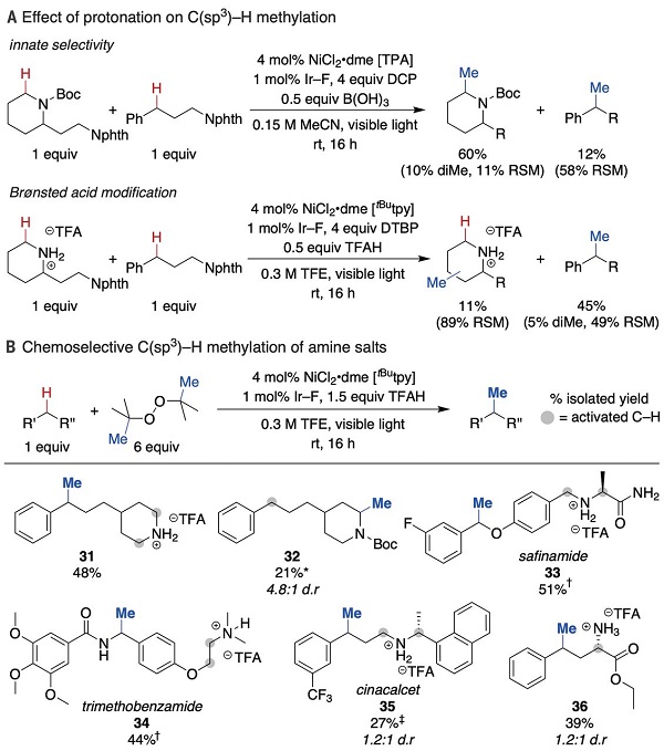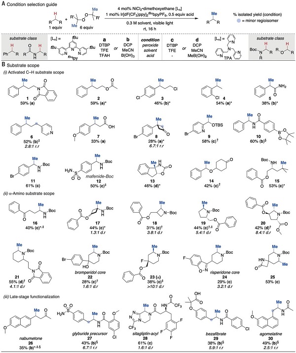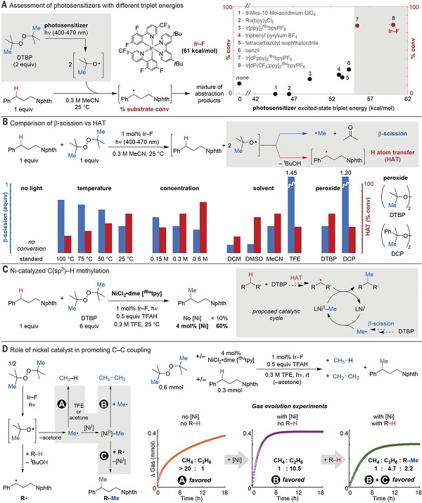 文献链接:C(sp3)–H methylation enabled by peroxide photosensitization and Ni-mediated radical coupling(Science, 2021, DOI: 10.1126/science.abh2623)