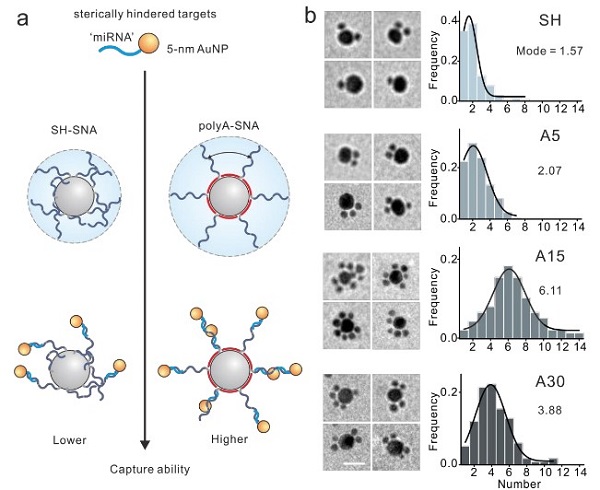 近日,上海交通大学变革性分子前沿科学中心王飞副教授团队开发了一种分割多聚腺嘌呤为球形核酸(polyA-SNAs)的方法,以有效捕获活细胞中的致癌性microRNA(miRNA)。研究发现,polyA-SNAs表现出较高的细胞摄取效率,对抗miRNA序列的结构不敏感。通过编程polyA的长度,作者可以精确地设计polyA-SNA中抗miRNA序列的空间结构。与密集紧实的SNAs相比,间隔化的polyA-SNA与miRNAs结合具有更强的捕获能力。进一步研究证明,polyA-SNAs可作为高效的miRNA海绵,用于捕获活细胞和小鼠体内的致癌性miRNA。通过对miRNA的有效捕获可显著抑制体内外肿瘤的生长。该论文以题为“Compartmenting poly-adenine-based spherical nucleic acids for efficient live-cell microRNA capture”发表在知名期刊Angew. Chem. Int. Ed.上,焦凯、闫庆龙、郭琳洁为共同第一作者。
