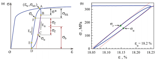 图2 (a)卸载-再加载回路曲线,其中的字母所代表的含义分别是卸载屈服σu,σr、背应力σb、摩擦应力σf、有效卸载杨氏模量Eu、有效再加载杨氏模量Er;(b)用σu和σr定义了GS IF钢试样的卸载-再加载回路曲线[1]。
