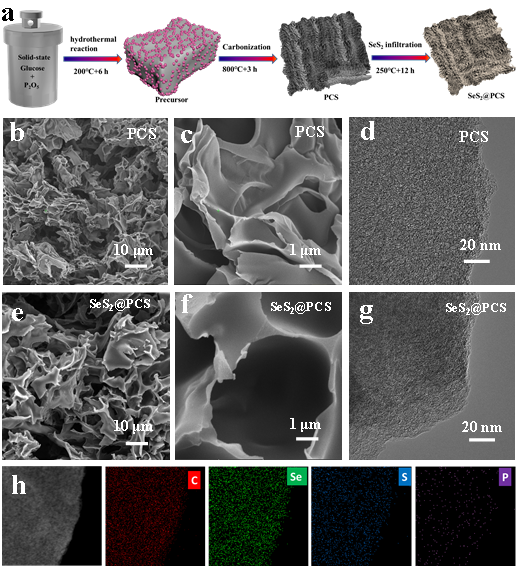 e-g)SeS2@PCS的SEM 和TEM 照片;