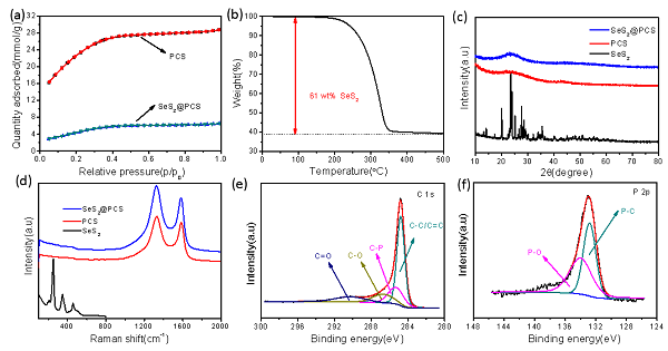 c)PCS, SeS2, SeS2@PCS的XRD图谱;