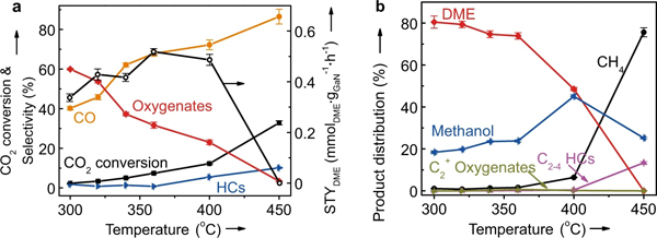 b)DME(STYDME)的不同产物的选择性和时空产率。误差棒的相对偏差为5%。 反应条件:P = 2.0 MPa,T = 360°C,H2/CO2 = 2,气体每小时空速= 3000ml g−1 h−1。