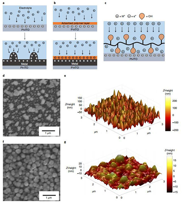 (b)吸附有聚合物抑制剂促进金属均匀电沉积的示意图;