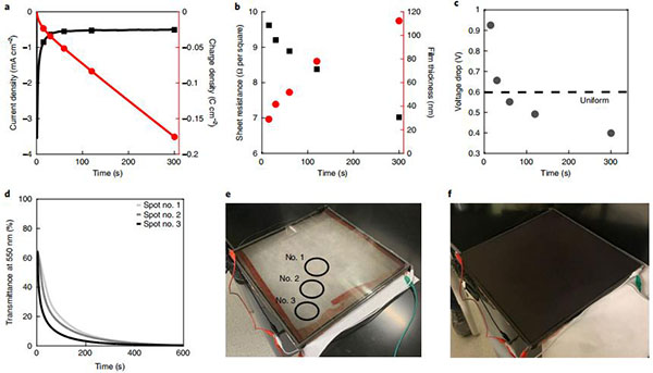 (c)从929 cm2 ITO电极的边缘到中心的电压降与沉积时间的关系;