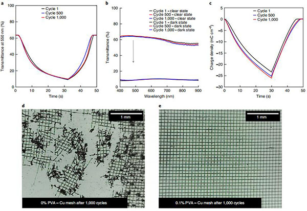 近日,美国科罗拉多大学Michael D. McGehee教授(通讯作者)报道了使用聚合物抑制剂聚乙烯醇(PVA),在动态窗口中可逆地沉积具有受控形态的金属膜(光滑,致密的金属膜)。使用聚合物抑制剂的窗户可以在不到3分钟的时间内,轻易地将可见光透射率降至0.001%以下,并显示出高红外反射率(> 70%)和色中性透射率(C*<5),以及比任何现有技术更广泛的可见光和太阳调制范围。用PVA生长的金属膜,其改进的光学和电学性质,允许构建具有快速且均匀着色的大于 900 cm2动态窗户。更加重要的是,该聚合物添加剂通过促进数千个周期的稳定和可逆电沉积,提高了RME动态窗户的耐久性。相关研究成果以“Polymer inhibitors enable >900 cm2 dynamic windows based on reversible metal electrodeposition with high solar modulation”为题发表在Nature Energy上。