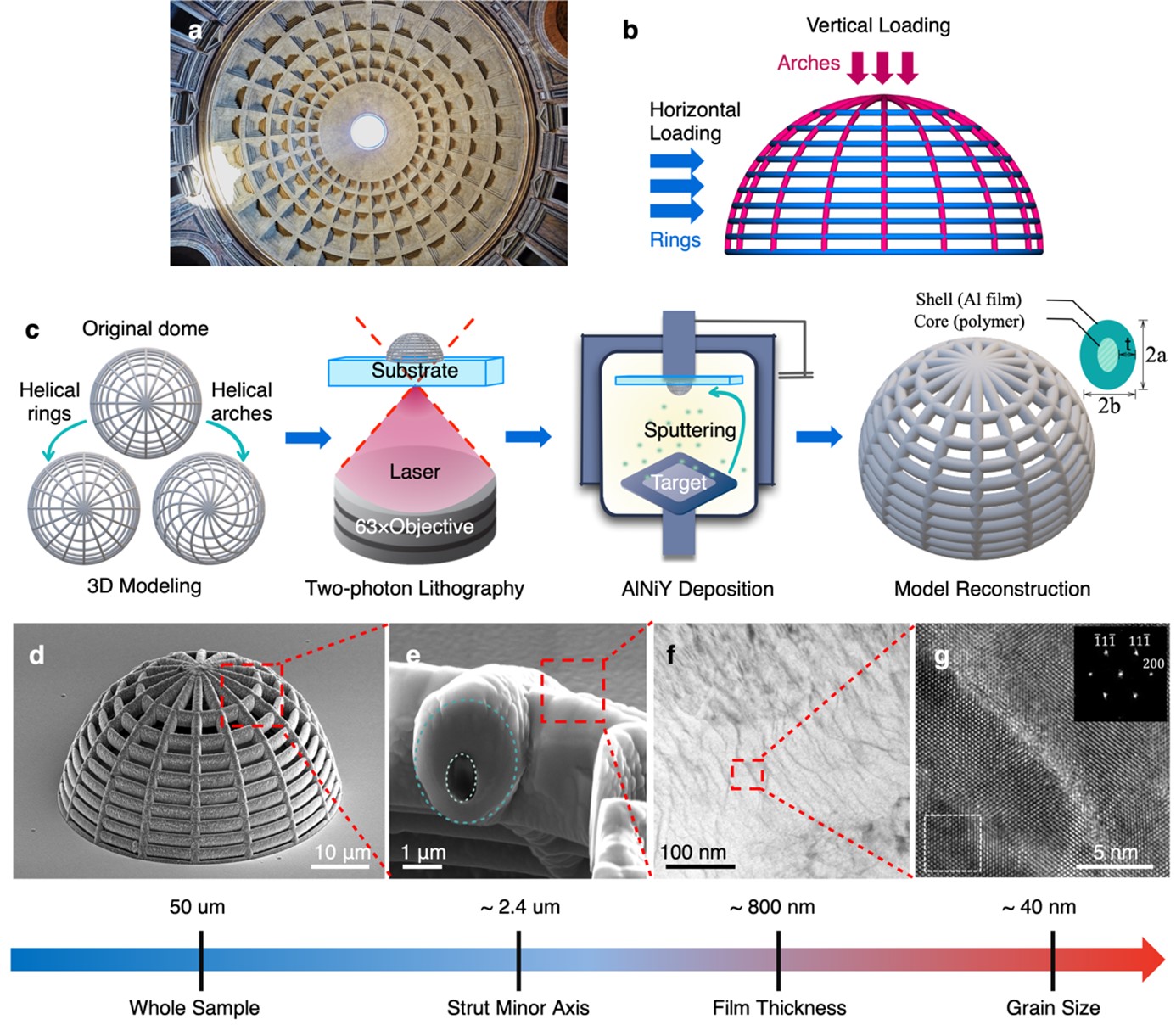 我们的灵感来自保存最完好的古罗马古迹-万神殿。米开朗基罗在 1500年早期见到万神殿时,他宣称这是:「天使所成,而非人为的设计」 。他的设计万神殿拱顶在罗马中心已经屹立了近500年, 作为当时最大的穹顶建筑,同时拥有高承载和低密度的特点。鉴于此,团队设计了具有梯度螺旋的穹顶机械超材料,首次结合“超纳双相玻璃晶体”金属涂层,得到的层级结构以其超轻、超高强度和良好的延展性的独特组合特性,扩展了材料特性的空间范围。