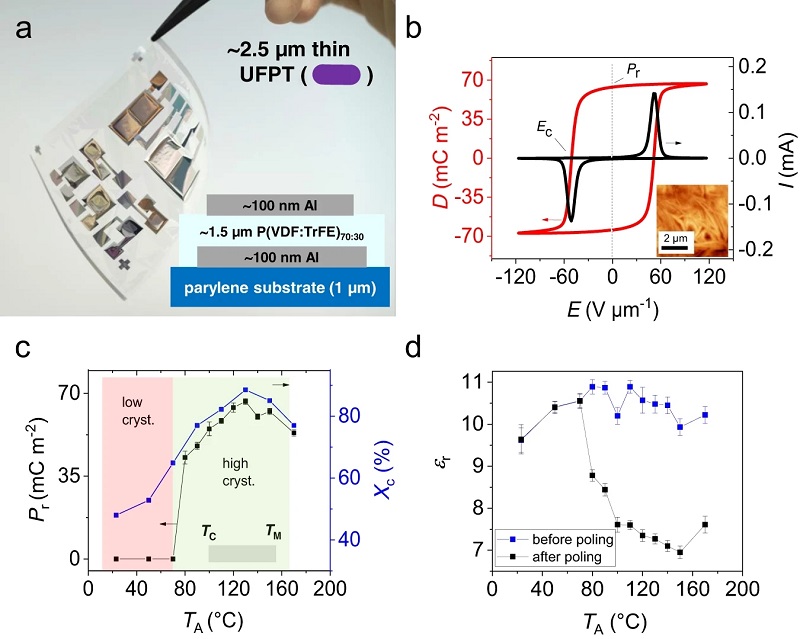 图二、超柔性铁电聚合物换能器(UFPT)器件以及其铁电和介电特性