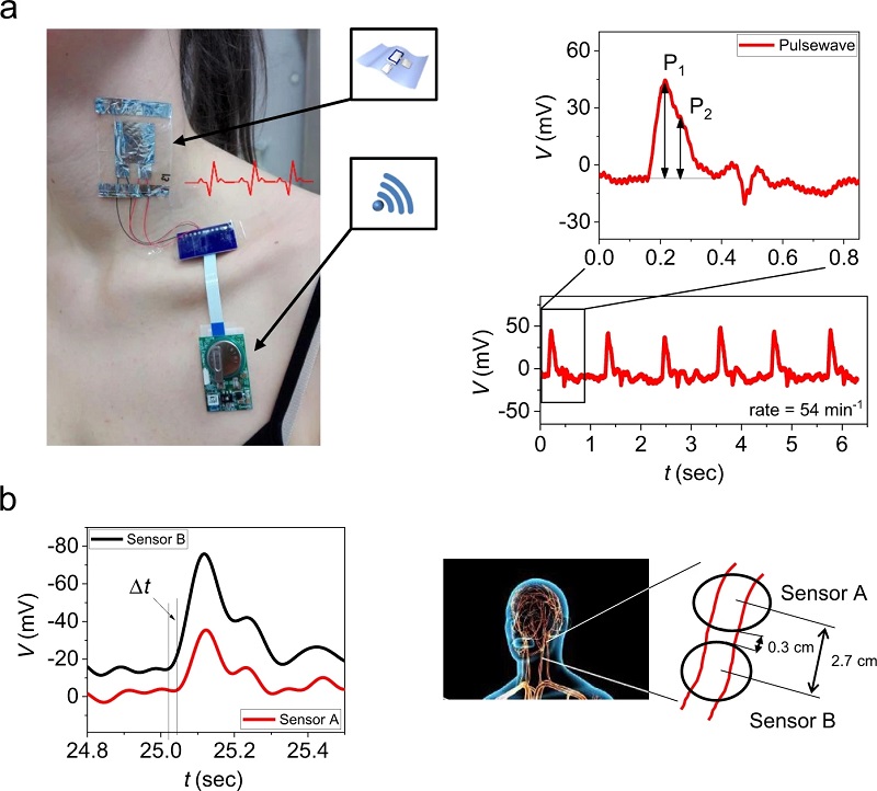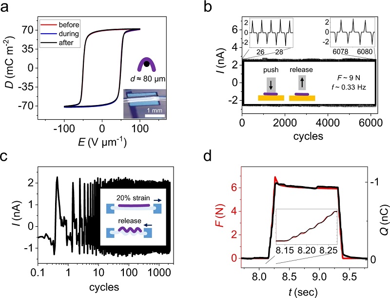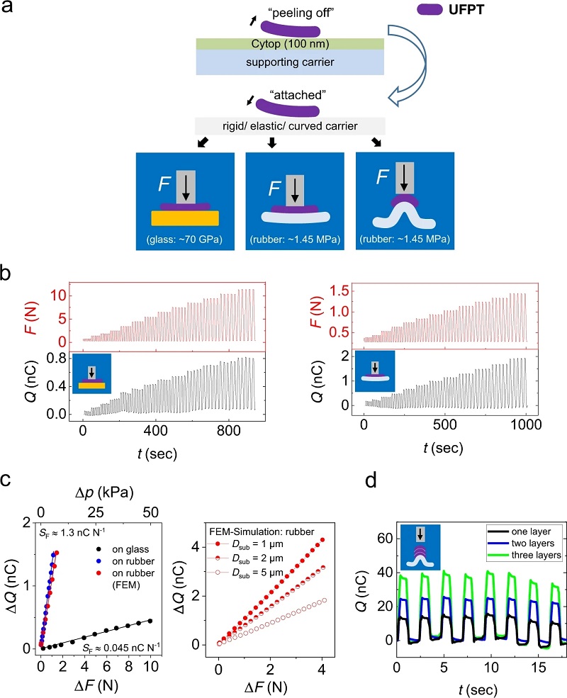 (a)在1 µm薄diX-SR(聚对二甲苯)基底上超柔性P(VDF:TrFE)70:30基传感器的图片及其器件结构示意图;