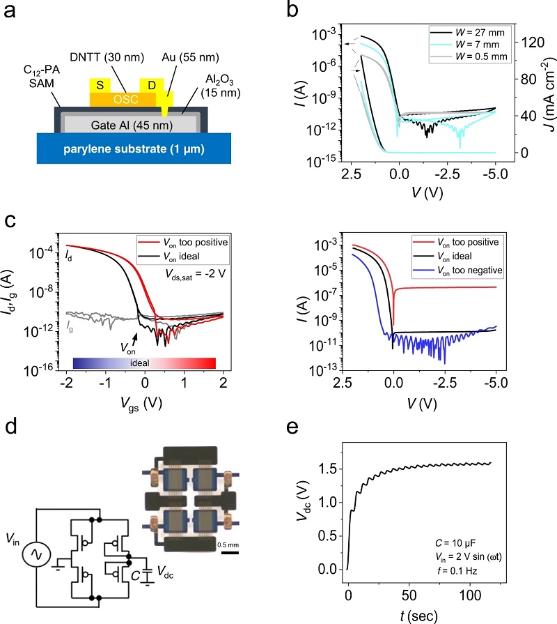 (a)通过缩短漏极和栅极触点用OTFT构建有机整流二极管的示意图;