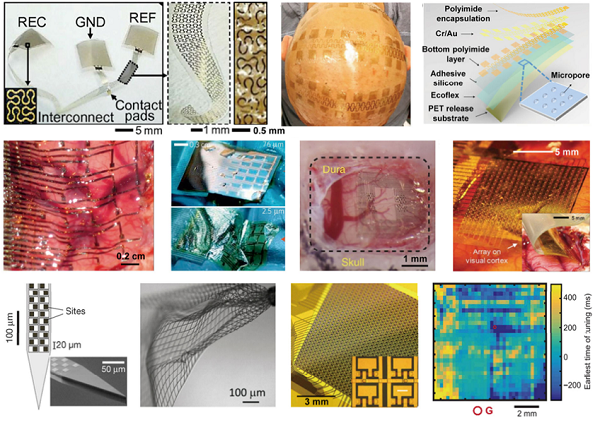 用于电神经调节的早期工具是附着在半导体衬底上的刚性硅探针阵列。使用这些探针,在大脑皮层1.5 mm以下可以进行电神经调节,并且可以刺激100个不同的部位。此外,使用半导体微制造工艺,已经开发了许多电神经调节装置。然而,这些装置由易碎的刚性材料组成,这导致组织损伤,包括在神经调节装置周围形成纤维包裹和胶质瘢痕组织。因此,慢性植入和神经调节受到电极-组织阻抗增加的限制。为了克服装置的机械失配,已经应用了电极的柔软和保型设计。