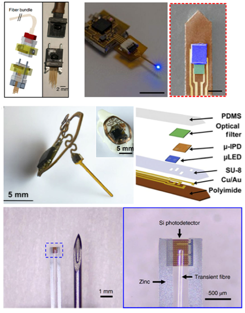早期的设备是基于光纤,光纤被植入特定的大脑区域。在这个装置中,纤维将特定波长的光传输到神经元,并收集与钙神经活动相关的全部荧光。尽管在细胞水平上记录单个神经元的活动有局限性,但记录所有神经元对自由运动受试者的活动是可能的。因此,已经进行了许多研究来考虑在大脑中使用简单、通用和长期植入物的可能性。
