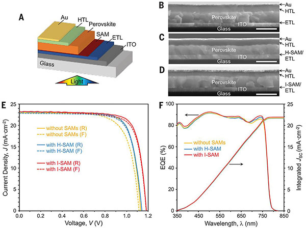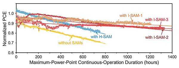 今日,美国布朗大学Nitin P. Padture教授团队使用碘端自组装单层(I-SAM)作为“分子胶”,证明了MHP薄膜和底层SnO2电子传输层(ETL)之间的脆性界面大幅增韧。这一处理步骤不仅提高了PCE(高达21.44%),减少了迟滞现象,而且还提高了在1个太阳最大功率点(MPP)下连续运行的稳定性(预计保留初始PCE 80%的时间可达~4000小时)。经过运行稳定性测试的PSCs的特性表明,I-SAM有助于保持ETL/MHP接口的机械完整性,而在以前的PSC研究中所谓的操作稳定性与机械可靠性密切相关。此外,SAMs已被用于增韧其他类型器件的界面,同时改善其他功能性能,如导热性。该成果以题为“Interfacial toughening with self-assembled monolayers enhances perovskite solar cell reliability”发表在了Science上。