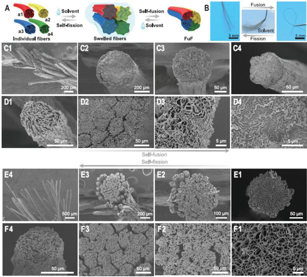 (A)溶剂触发精确可逆的GO纤维自溶和自裂变原理图,其中a1至a4等单个纤维通过溶剂溶胀自适应变形,形成较厚的纤维FuF。干燥的FuF在溶剂(如水)中溶胀,逐渐裂成a1到a4的原始较薄纤维,而无需在它们之间交换GO薄片。