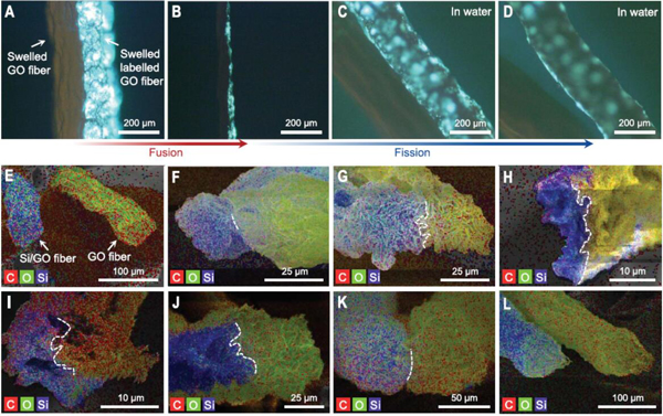 (E-L)碳(红色)、氧(绿色)和硅(蓝色)的连续重叠元素分布图像,显示了水诱导的融合(顶部)和裂变(底部)过程,涉及一个整齐的GO纤维和一个Si/GO纤维。虚线表示纤维间的界面,表明熔合后的协同皱褶壳层互锁,裂变后相应的形貌恢复。