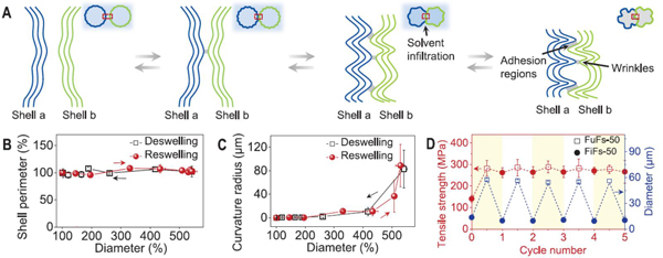 (A)纤维界面上导致自融合和导致自裂变的可逆恢复的壳的形貌皱褶示意图。