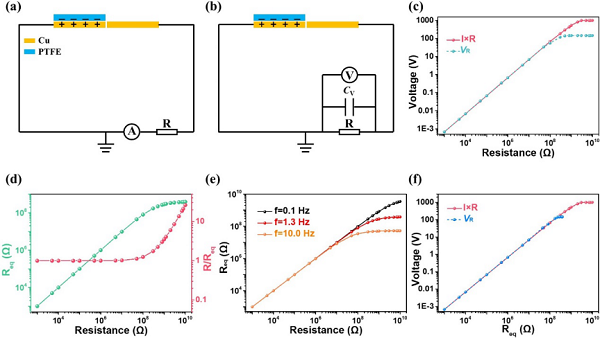 图4. 以水平滑动独立摩擦层模式TENG为例,对比接地电压表测量法和接地电流表测量法得到的输出电压,并校准接地电压表测量法测量的输出电压值。接地电流表测量法(a)和实际情况下接地电压表测量法(b)测量输出电压的等效电路,以及分别测量的输出电压(c)。(d)对比不同的电阻下,等效阻抗与电阻的大小关系。(e)对比在不同的工作频率f下,电压表的Cv并联电阻得到的等效阻抗。(f)展示在等效阻抗下,接地电压表测量法和接地电流表测量法得到的输出电压曲线基本吻合。