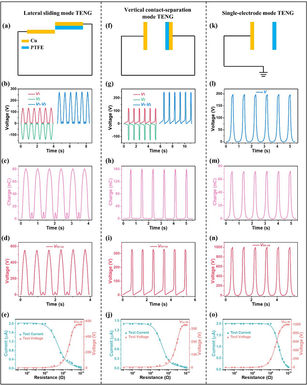 图3. 另外三种基本工作模式TENG,对比按照公式计算Voc和非接地电流表测量法测量的Voc。水平滑动模式TENG的(a)等效电路,(b)非接地电压表测量法测量的Voc,(c)Qsc测量结果,(d)用固定电容反推法得到的公式计算的Voc,(e)非接地电流表测量法测量的电流和电压曲线。垂直接触-分离模式TENG的(f)等效电路,(g)非接地电压表测量法测量的Voc,(h)Qsc测量结果,(i)用固定电容反推法得到的公式计算的Voc,(j)非接地电流表测量法测量的电流和电压曲线。单电极模式TENG的(k)等效电路,(l)一个电压表的测量结果,(m)Qsc测量结果,(n)用固定电容反推法得到的公式计算的Voc,(o)电流表串联电阻测量的电流和电压曲线。