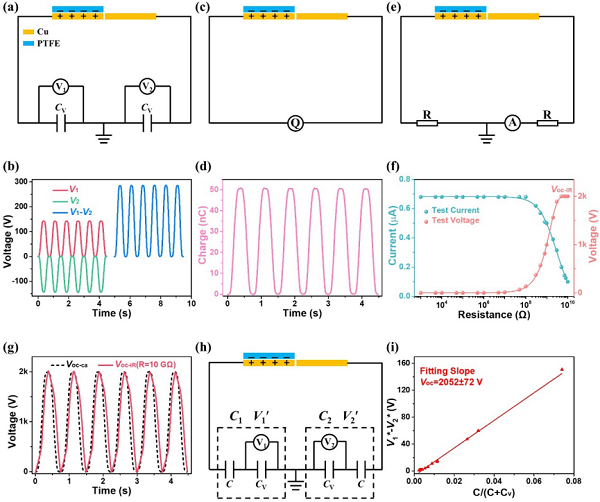 图2. 以水平滑动独立摩擦层模式TENG为例,对比用校准公式计算Voc和非接地电流表测量法测量的Voc。(a)非接地电压表法测量Voc的等效电路,以及(b)测量结果。(c)测量Qsc的等效电路,以及(d)测量结果。(e)非接地电流表测量法测量Voc的等效电路,以及(f)测量结果。(g)对比用固定电容反推法得到的公式计算Voc和非接地电流表测量法得到的Voc的波形。(h)变化电容拟合法计算Voc的等效电路,以及(i)拟合直线得到的Voc。