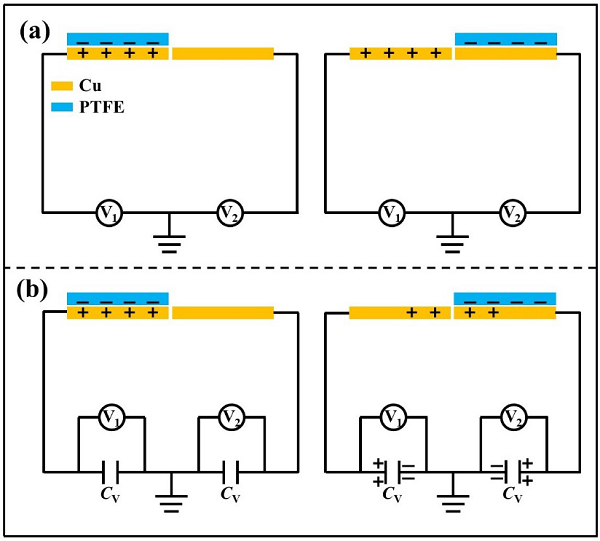 图1. 以水平滑动独立摩擦层模式TENG为例,展示Voc的非接地电压表测量法中电压表的内部等效电容Cv对感应电荷造成的影响。(a)理想情况下Voc的非接地电压表测量法的等效电路,电压表等效于开路。(b)实际情况下Voc的非接地电压表测量法的等效电路,电压表存在Cv,感应电荷会转移到电压表的Cv中。