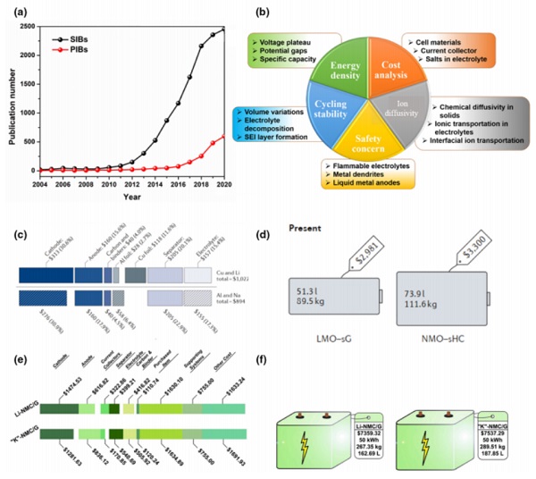 (a)WOS中涉及关键词“钠离子电池”或“钾离子电池”的研究出版物的数量 (b)有关可伸缩储能设备及其相关问题的五个关键指标 (c)分别基于LMO/C和NMO/C模型计算的LIB和SIB的电池材料成本 (d)本模型LMO,LiMn2O4的总成本,体积和质量; NMO,β-NaMnO2;sG,合成石墨;sHC,标准硬碳(e)LiNiMnCoO2/石墨(LNMC/G)和KNiMnCoO2/G(KNMC/G)电池的成本明细(f)LNMC/G和KNMC/G电池的总成本,可用能量,质量和体积