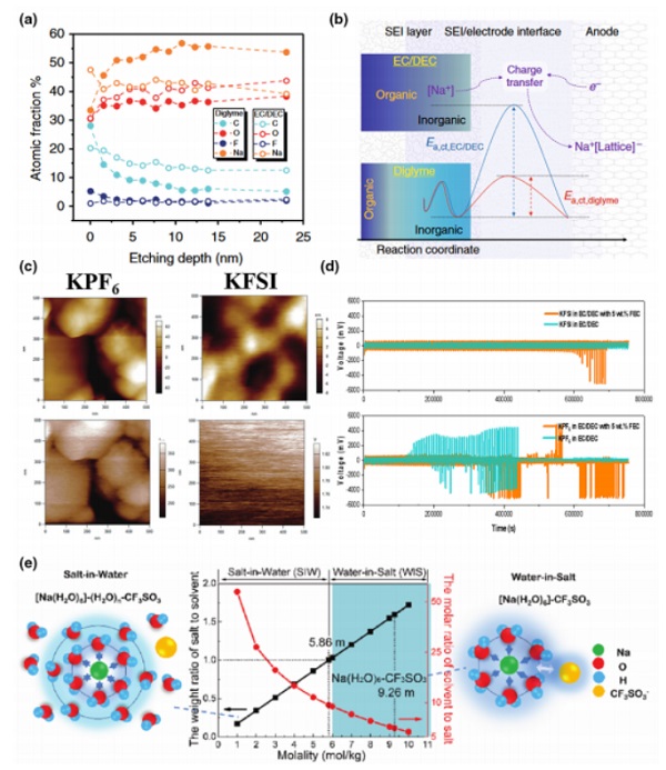 (a)C,O,F和Na的原子分数作为SEI深度的函数,由X射线光电子能谱(XPS)深度分布谱计算得出 (b)在不同电解质中形成的SEI组合物的示意图以及电荷转移能垒的比较(c)用于KPF6和KFSI电解液的Bi/rGO电极的表面高度图和表面电势图 (d)在50 mA/g的条件下比较带有各种电解质(有或没有FEC)的电池的循环性能 (e)三氟甲磺酸钠(NaOTf)-H2O二元体系中的溶剂化结构