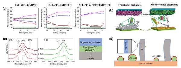 (a)在不同电解质循环的锂金属上进行不同时间的Ar+溅射后,SEI的组成 (b)在不同电解质中形成的不同SEI和CEI化学的示意图(c)各种溅射时间后的O和F XPS光谱以及从XPS深度剖析得出的SEI结构 (d)源自cryo-STEM的SEI结构的示意图