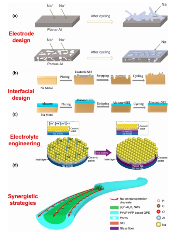 (a)在平面和多孔铝箔上沉积钠的示意图 (b)在裸露的Na箔和带有MLD的Alucone涂层的Na箔上进行Na剥离/电镀的示意图 (c)陶瓷固体电解质颗粒与钠金属的接触模型,其具有在镀钠过程中具有良好润湿能力的人工夹层 (d)β/ β’’-Al2O3纳米线(Ans)–凝胶聚合物电解质(GPE)的结构和钠离子迁移机理