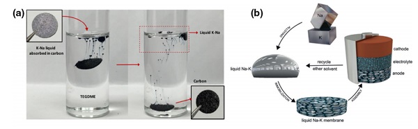 (a)从碳中提取K-Na液体 (b)液态Na-K合金用于阳极的示意图
