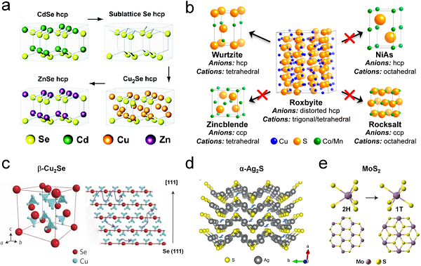 (a) 纤锌矿型(WZ)CdSe到Cu2Se和WZ-ZnSe阳离子交换过程中的Se晶格保持,(b) 五硫铜矿型Cu2-xS通过阳离子交换向WZ-CoS和MnS的相选择转化,(c) 高温下面心立方β-Cu2Se晶体结构中Cu+离子在[111]晶面间的迁移,(d) 室温下单斜α-Ag2S晶体结构中沿[001]方向晶面间的移动,(e) 单层MoS2从三方棱柱半导体相(2H)向八面体金属相(1T)的晶相转变。