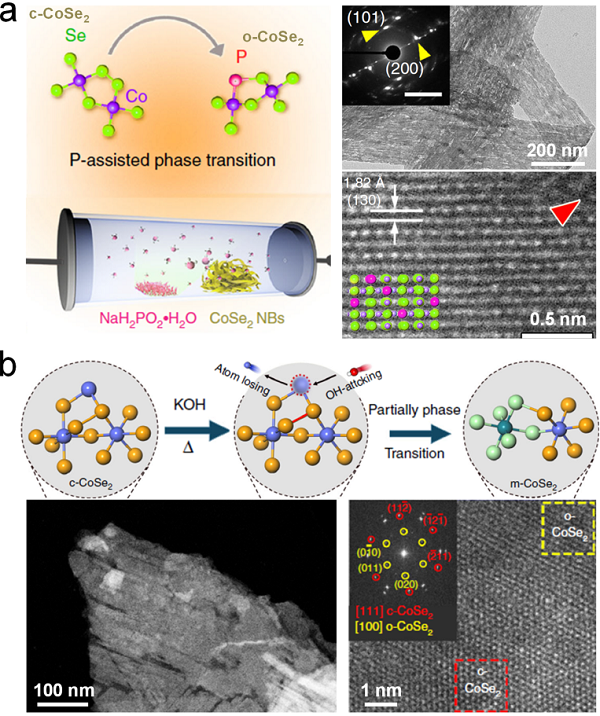 (a) 立方相(c)到正交相(o)CoSe2纳米带的退火-P掺杂诱导相变示意图和TEM、HAADF-STEM图像,(b) c到c/o-CoSe2纳米带的碱加热诱导相变示意图、HAADF-STEM和HRTEM图像。