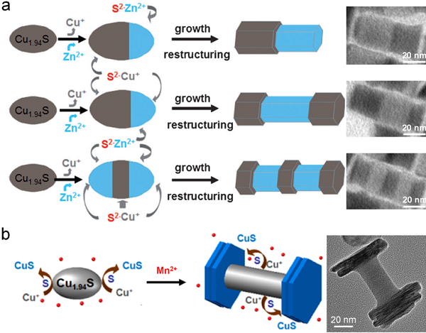 (a) Cu1.94S纳米颗粒到螺杆型、哑铃型和三明治型Cu1.94S-ZnS异质纳米结构的转化过程示意图和TEM图像,(b) Cu1.94S纳米颗粒到自耦合哑铃状Cu1.94S-CuS异质纳米结构的转化过程示意图和TEM图像。