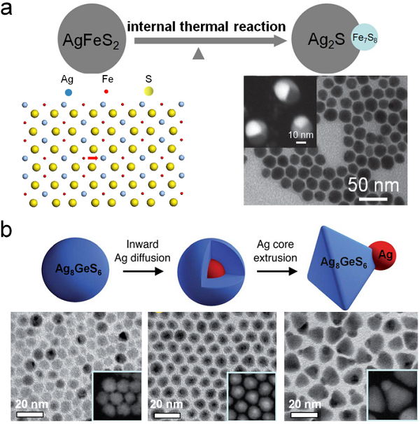 (a) AgFeS2纳米颗粒到Ag2S-Fe7S8二聚体异质纳米结构分离过程的示意图、TEM图像和HAADF-STEM图像,(b) Ag8GeS6纳米颗粒到Ag-Ag8GeS6异质纳米结构的Ag向内扩散和向外析出过程的示意图、TEM图像及HAADF-STEM图像。