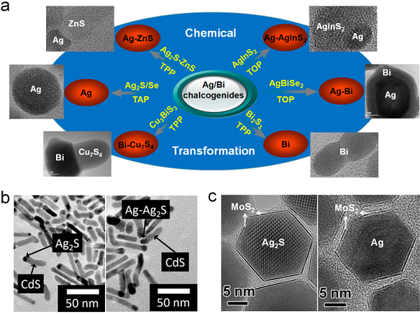 (a) 三烷基膦(TAP)驱动化学转化为Ag基和Bi基硫族纳米晶体的路线示意图和TEM图像,(b) 三正辛基膦(TOP)驱动提取Ag2S-CdS中的部分S转化为Ag-Ag2S-CdS的TEM图像,(c) TOP驱动提取Ag2S-MoS2中的S转化为核壳结构Ag-MoS2的HRTEM图像。