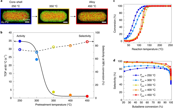 (c)丁二烯转化率与在不同温度下预处理的Au@Pd@SiO2 NR反应温度的函数关系;