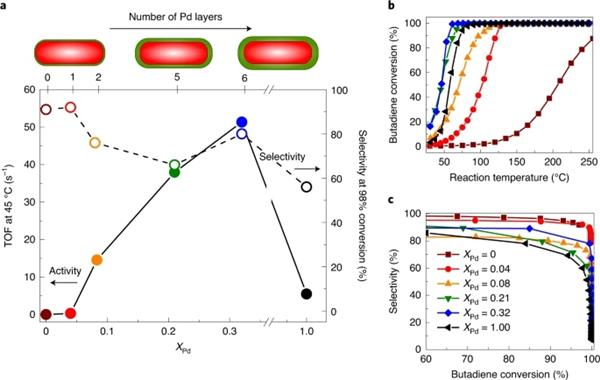 近日,荷兰的乌得勒支大学的Petra E. de Jongh和Alfons van Blaaderen(共同通讯作者)等人设计双金属Au-Pd纳米催化剂的原子分布,在丁二烯选择性加氢中获得了协同的催化性能。单晶Au核Pd壳纳米棒的活性是对应的合金和单金属催化剂活性的50倍,同时保留了高选择性。壳厚度与催化活性相关,表明表面的性质和亚表面的层数在催化性能中都起着至关重要的作用。本文同时采用密度泛函理论模拟,在理论上证实了这一发现。这为双金属催化剂的结构设计开辟了另一条途径。相关成果以“Unlocking synergy in bimetallic catalysts by core–shell design”发表在Nature Materials上。