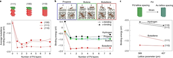 (a)丁二烯的平均吸附能随{100},{111}和{110}表面上Pd层数的变化而变化;