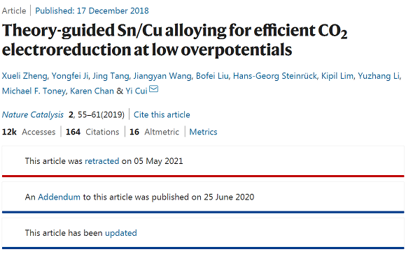 2021年5月5日,Nature Catalysis宣布撤回首次发表于2018年12月17日的一篇论文,该篇论文曾于2020年6月25日被编辑部关切,整个发表到撤稿耗时近两年半。目前,这篇论文已经被引用164次,在线浏览次数达1.2万次。