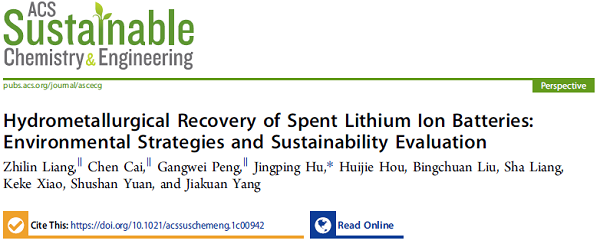 近日,华中HTH官网地址 大学胡敬平教授(通讯作者)发表的综述系统地总结了近年来废旧锂离子电池回收在水热浸出方向上的研究进展,并提出针对回收过程的可持续性评估及优化方法。回收废旧锂离子电池主要包括预处理、金属回收、选择分离和产物再利用几个步骤。文章着重总结了金属浸出方法,包括酸浸出、碱浸出、还原浸出、强化浸出等,还总结了各浸出方法的机理,并分析了其优缺点。最后,文章总结了近年针对锂电池回收过程的生命周期评价研究,评估了不同回收工艺的可持续性,并提出了可行的优化策略以提升回收过程的环境效益。相关成果以题为 “Hydrometallurgical Recovery of Spent Lithium Ion Batteries: Environmental Strategies and Sustainability Evaluation” 发表在期刊 ACS Sustainable chemistry & Engineering (2021, 9, 17, 5750-5767)上, 华中HTH官网地址 大学环境学院梁智霖,蔡晨和彭刚伟硕士研究生为共同一作。