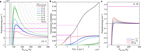 今日,在哈佛大学倪康坤教授和Liu Yu(共同通讯作者)团队带领下,报告了2KRb→K2 + Rb2反应的全部产物状态分布。反应物的超冷制备能够完全控制它们的初始量子自由度,而对两种产物的状态解析、重合检测使散射到57个允许的旋转状态对中的每一个的概率得以测量。结果显示,与基于统计理论的状态计数模型总体上是一致的,但同时也揭示了几个偏离的状态对。特别是,团队观察到在最接近外能极限的状态对中,由于长程力抑制了产物的逃逸,产量受到了强烈的抑制。测量的完整性为量子动力学计算提供了一个超越当前技术水平的基准。相关成果以题为“Precision test of statistical dynamics with state-to-state ultracold chemistry”发表在了Nature。