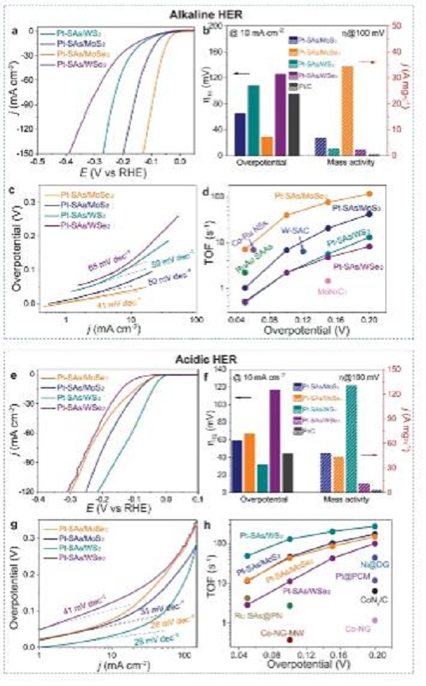 c, g 酸性HER和碱性HER中不同的Pt-SAs/TMD的塔菲尔极化曲线