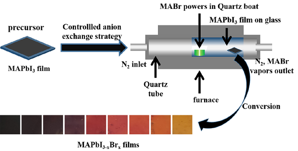 该研究中作者简单阐述了气/固相阴离子交换策越的原理,即加热MABr粉末产生少量的MABr蒸汽与前驱体MAPbI3薄膜(或其他形貌的钙钛矿材料)进行缓慢的阴离子交换。