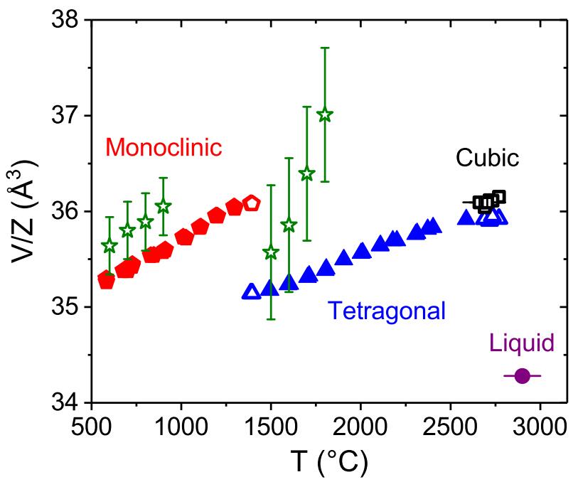 图二、在氩气气氛中测量的HfO2的单斜相(五边形)、四边相(三角形)和立方相(正方形)的晶胞体积