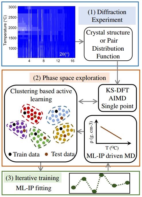 难熔氧化物是高温陶瓷材料、热障涂层和核应用的重要组成部分,它们的高熔化温度(Tm>1500 ℃)不仅使耐火材料具有绝缘性和防止氧化的能力,而且还可在恶劣环境中使用。因此,识别熔点附近的相变和结构重排是很重要的。其中,X射线粉末衍射是材料表征的主要手段,其提供了与不同大气中的相变有关的晶体相、热膨胀和体积变化的数据。中子粉末衍射也提供了有价值的结构信息,特别是对氧等较轻元素,但是通常需要较大的样品和较长的计数时间。然而,在高于2000 ℃下,用于X射线和中子衍射实验的合适容器很少。在计算建模方面,从头算分子动力学模拟(AIMD)提供了具有量子力学精度的原子尺度分辨率,但是受到模拟时间短、系统规模小的限制。机器学习原子间电势(ML-IP)保持了与从头计算相似的精度,同时在更大的系统规模(通过线性标度)和时间尺度上提供与经典原子间电势相当的原子分辨率。主动学习是机器学习的一个子领域,其中无监督机器学习以最少的训练配置得到最优的有监督机器学习模型(ML-IP)。