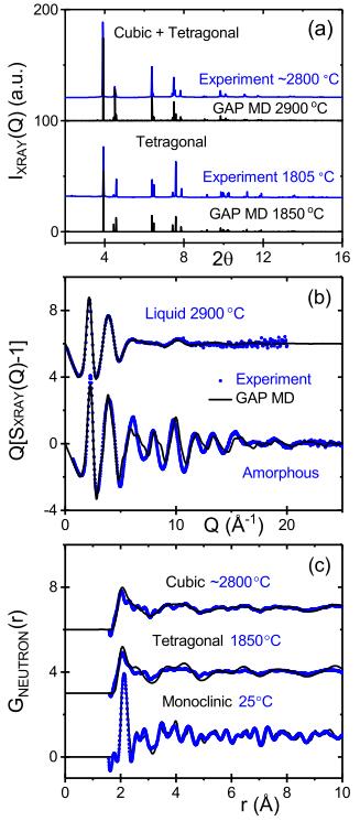 (a)X射线衍射图与GAP MD计算的两个高温相的X射线强度(λ=0.123-59 Å)相比,衍射与模拟数据的关系;
